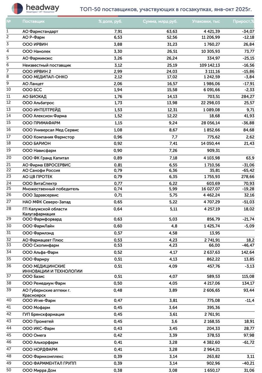 Представляем обновлённый рейтинг компаний, участвующих в государственных закупках ЛС за период янв–окт 2025г. 🔹 Фармстандарт сохраняет первое место: доля рынка 7,9% и 63,63 млрд рублей, однако убыль составляет 34,07% к аналогичному периоду прошлого года. 🔹 Р-Фарм занимает вторую строчку с долей 6,53%, но падением 12,18% к янв-окт ‘24. 🔹Ирвин на третьей позиции, с приростом 26,8% и объёмом продаж 31,23 млрд руб. 🔹В топ-5 также входит Нанолек с самым большим приростом (из топ-5) - 73,7% и объёмом продаж 26,51 млрд руб. ♦️Наибольший прирост ⤴️: 1. АО Биокад +284,27% 2. АО ЦВ Протек +278,66% 3. ООО Альфа-Фарм +142,64% 4. ООО Ремедиум Фарм +134,17% 5. ООО Базис +115,08% ♦️Падение ⤵️: 1. АО НАЦИМБИО -94,88% 2. ООО Эдвансд Трейдинг -69,83% 3. АО Санофи Россия -65,42% 4. ООО Алькорфарм -61,72% 5. НАО МФК Северо-Запад -51,03% Будем продолжать следить за динамикой топовых игроков фарм.рынка. Подписывайтесь на наш ТГ-канал