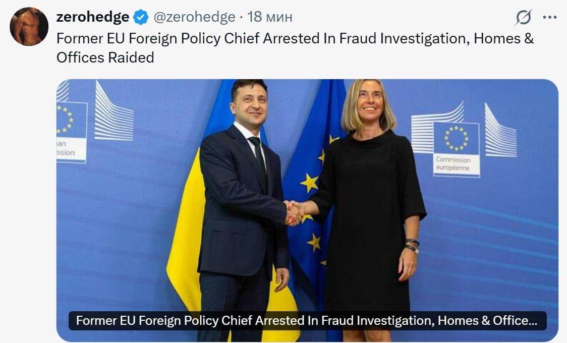 ‼️"Бывший глава внешнеполитического ведомства ЕС арестована в ходе расследования дела о мошенничестве, в его домах и офисах проведены обыски". -Former EU Foreign Policy Chief Arrested In Fraud Investigation, Homes & Offices Raided "Бывшая вице-президент Европейской комиссии и экс-глава внешнеполитической службы ЕС Федерика Могерини была задержана в ходе расследования бельгийскими властями предполагаемого нецелевого использования средств Европейского Союза , сообщили во вторник бельгийские и французские СМИ." 1️⃣ Ой а кто это у нас на фотографиях в западных публикациях? 2️⃣ Взяли не Урсулу и не Каллас. Но с пленками Миндича всё началось с Миндича, а не Ермака и Зеленского.