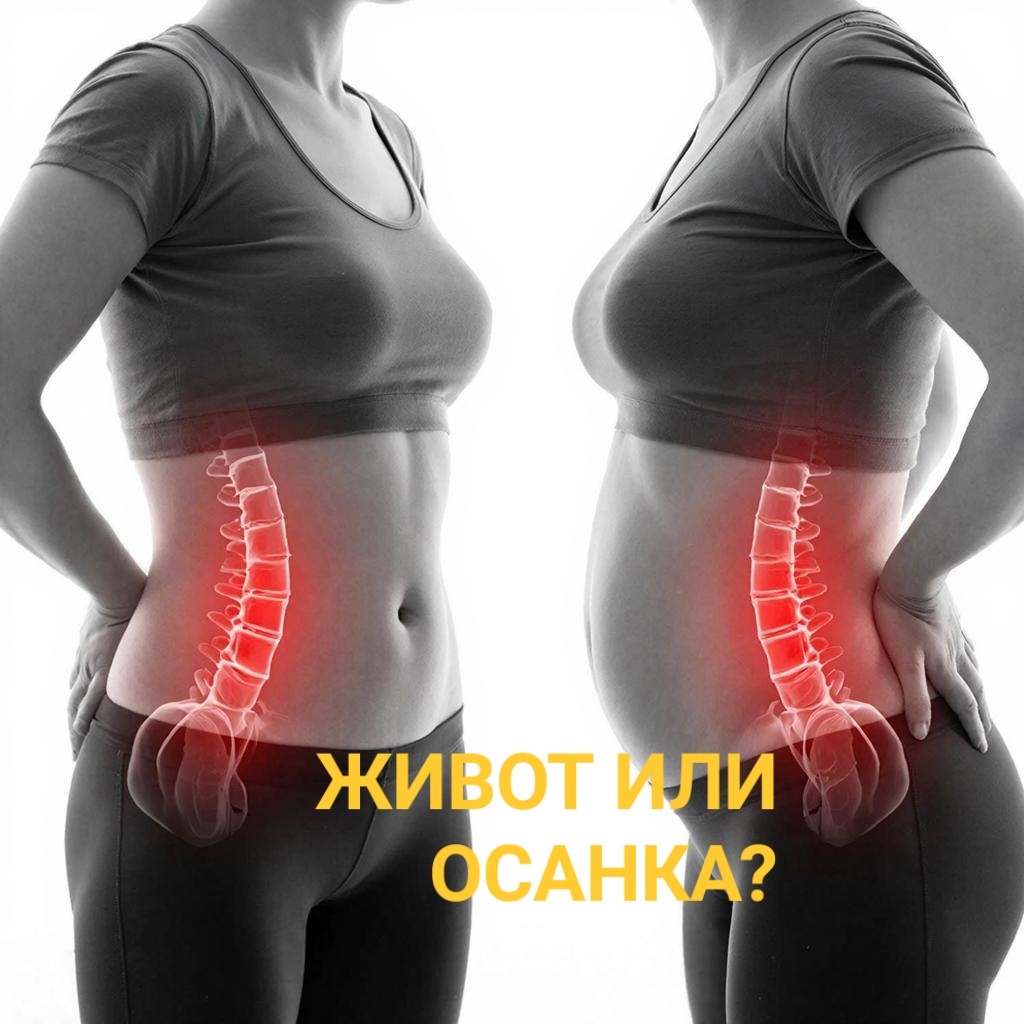 В прошлой статье мы проверяли пупок на опущение, а сегодня проверим спину, ведь причины могут быть связаны. Худею, а живот все равно торчит: как я узнала про гиперлордоз и убрала «валик» без диет (тест у стены) Знаете этот тип фигуры? Женщина может быть стройной, ноги худые, руки изящные. Но в профиль - предательски выпирает низ живота, а поясница сильно прогнута внутрь, как у инста-моделей. Врачи называют это «синдром Дональда Дака» (потому что хвост уточкой назад). Я боролась с этим животом годами. Голодала, качала пресс до жжения. Жир уходил отовсюду - даже грудь исчезла! А этот ненавистный валик под пупком оставался на месте. Оказалось, я боролась с ветряными мельницами. Проблема была не в жире. Проблема была в гиперлордозе - избыточном прогибе поясницы. Почему при лордозе торчит живот? Представьте себе таз как ведро с водой. В норме ведро стоит ровно. Вода (ваши внутренние органы) находится внутри. При гиперлордозе таз наклоняется вперед (как будто вы выливаете воду