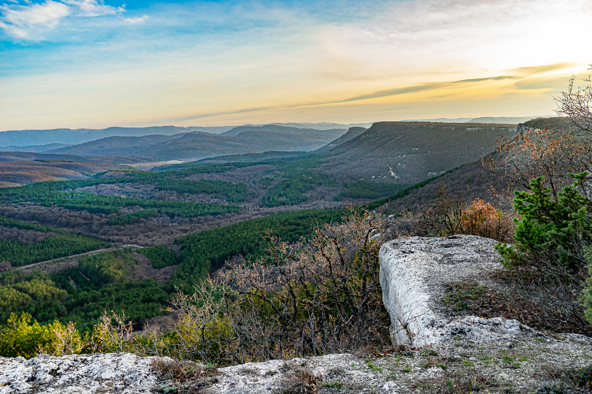 Так что есть, над чем подумать, поразмышлять, усевшись на краю обрыва, попить чайку. И полюбоваться открывшейся перспективой крымских привольных просторов. А слева от нас будет видна вытянутая Долгоруковская яйла и Чатыр-Даг, западнее – вершина Бабуган-яйлы и Главная гряда Крымских гор. И справа, один за другим просматриваются профили Беш-Коша, Чуфут-Кале и Тепе-Кермена.