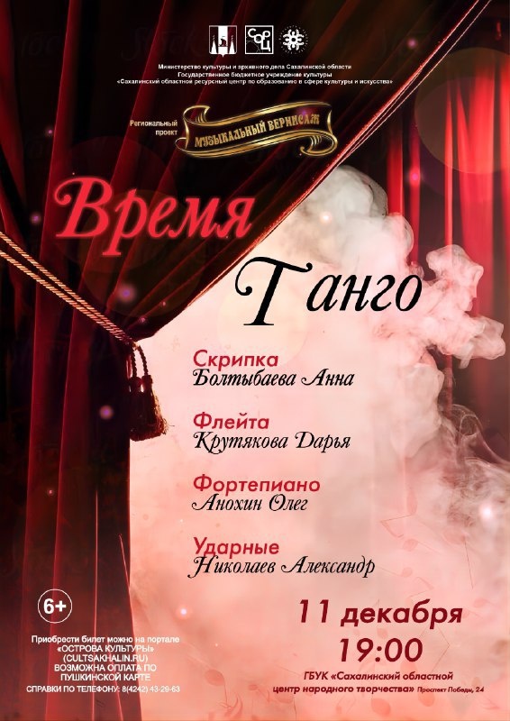 Приглашаем на концерт «Время танго» Купить билет: https://clck.ru/3Qe3Vx Погрузитесь в атмосферу «Времени танго» – концертного вечера, где мелодии современного инструментального танго прозвучат в исполнении любимых сахалинских артистов. Скрипка и фортепиано, флейта и ударные создадут живой диалог ритмов и эмоций – от мягкой лирики до стремительного импульса танца. Этот вечер станет особенно близким на пороге зимних праздников, даря тепло, движение и яркие впечатления. Концерт пройдет в рамках регионального проекта «Музыкальный вернисаж» при поддержке министерства культуры и архивного дела Сахалинской области.