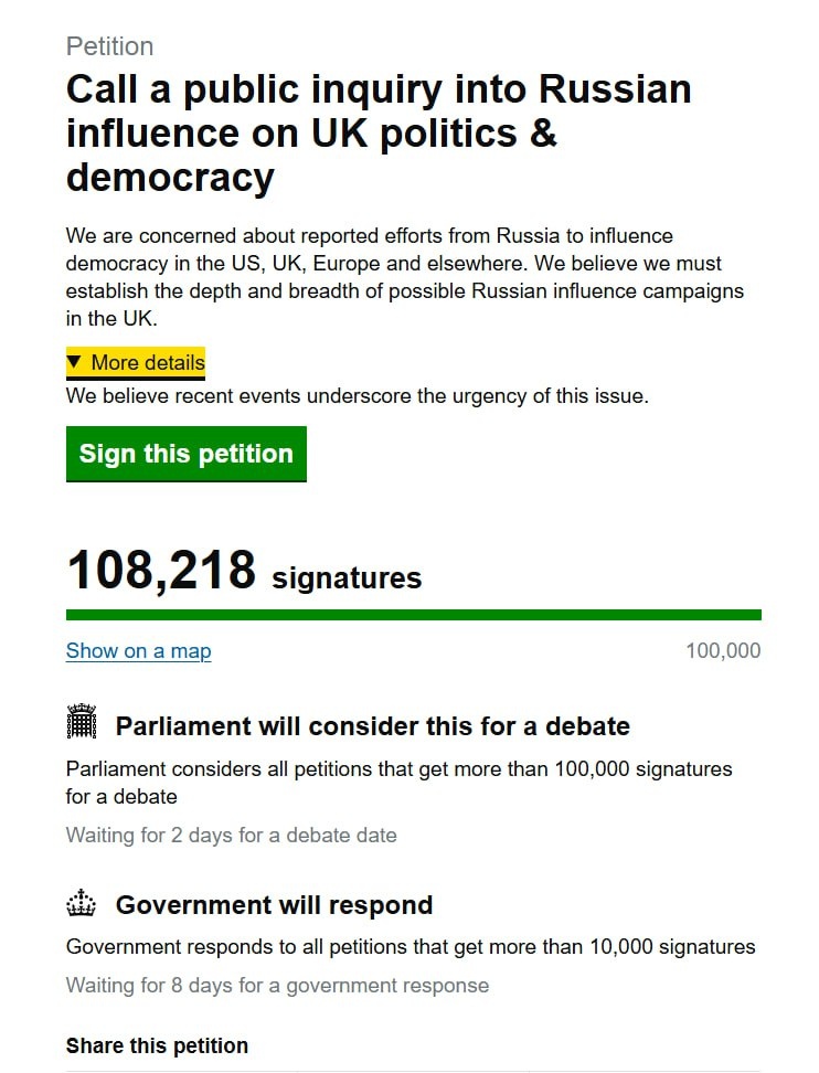 В мелкоБритании нашлось 108 тысяч душевнобольных, которые подписали петицию с требованием «расследовать влияние России» на политику страны