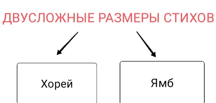 Стихотворные размеры — это порядок чередования ударных и безударных слогов в строке, который создаёт ритм стиха. Размеры делятся на двусложные (стопа из двух слогов — ударного и безударного) и трёхсложные (стопа из трёх слогов — ударного и двух безударных). Для удобства записи стихотворных размеров используют специальные символы: ударные слоги обозначают знаком «—», безударные — знаком «U», границы стоп — как «|». Хорей Двусложный стихотворный размер в силлабо-тоническом стихосложении. Состоит из первого долгого (ударного) и второго краткого слогов. Схема: _U | _U |, где _ — ударный слог, а U — безударный. Устаревшее название — «трохей». В российской литературе хорей использовали ещё с дописьменных времён: он часто встречался в былинах, старинных духовных и народных стихах, а также в частушках. Понятие «хорей» пришло из древнегреческого языка, где слово χορεῖος означало «плясовой» и происходило от χορεῖος πούς — «хоровая стопа». Со временем в литературном стихе хорей уступил м