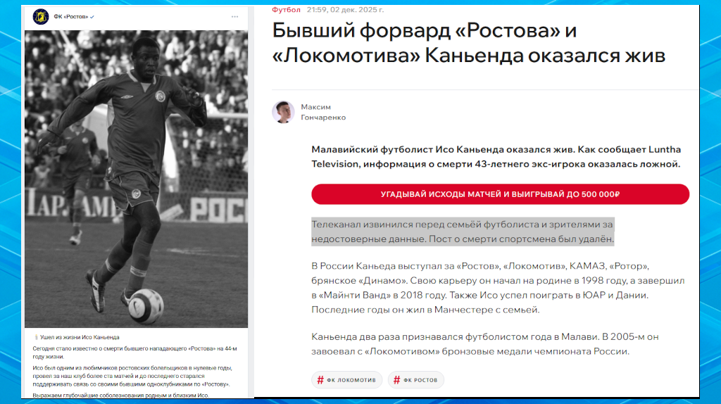 Новость о смерти экс-игрока брянского «Динамо» Исо Каньенды оказалась ложной