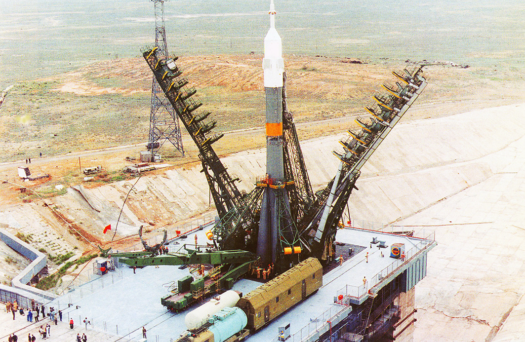 Итак, ракета «Союз» (та же самая Р-7 образца 1957 года, но с космическим кораблем вместо термоядерной бомбы) висит на четырех несущих стрелах. Почему ее повесили? Ракета имеет пакетную схему. Блоки первой ступени размещены вокруг блока второй ступени. Такая конструкция создает большую парусность. Большая парусность могла привести к сваливанию ракеты под воздействием сильного степного ветра. Кроме того, в ракету перед стартом заливается более 250 тонн топлива. Эти сотни тонн могут раздавить тонкий корпус ракеты, превратив ее в гармошку.