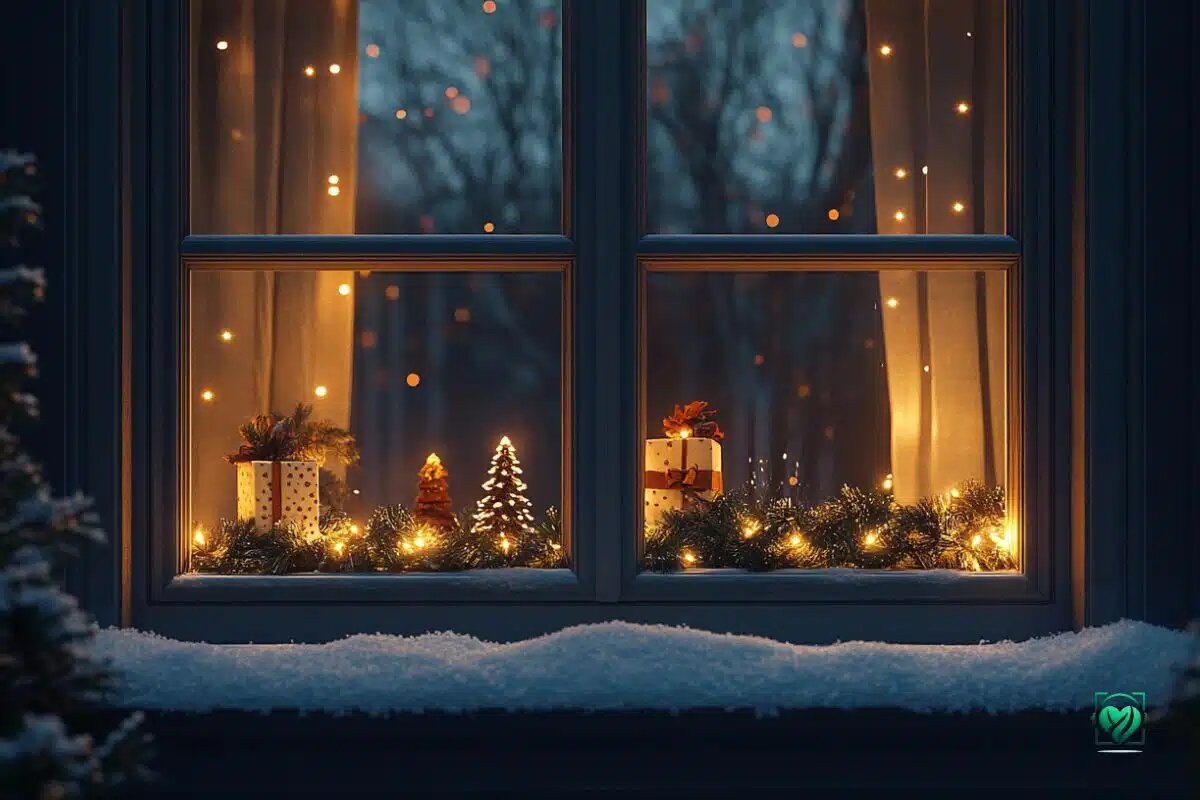 Рождественский венок на оконной раме -это особенно элегантный способ украсить окно к праздникам. Выберите венок из еловых веток, который можно украсить красными ягодами, лентами или маленькими елочными шарами. Подвесьте его к верхней части оконной рамы с помощью красивой ленты.