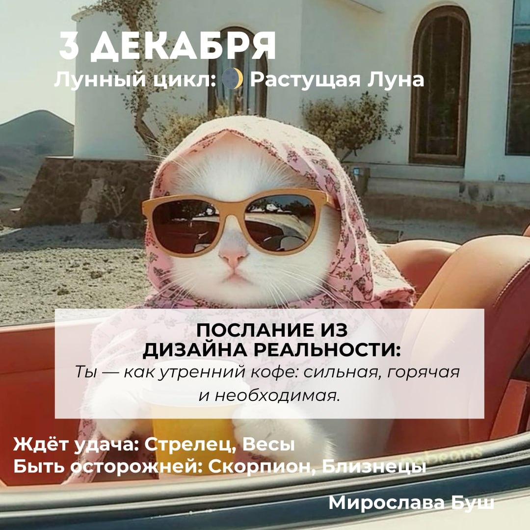 3 декабря РЕКОМЕНДАЦИИ: 🌿 Задайте себе один честный вопрос: «Что я хочу на самом деле — без чужих ожиданий?» Будьте честны с собой и внимательно слушайте, о чём заговорит ваша душа и сердце. ✨ Поменяйте одно «надо» на «хочу». Даже если это что-то маленькое: купить пирожное вместо правильного салата, пройтись пешком вместо автобуса. Пусть этот день станет чуточку волшебней) 🌟 Произнесите своё желание вслух. Громко или шепотом — не важно, главное озвучить. Так вы запускаете совершенно другую энергию, которая будет притягивать самые замечательные вещи и события в вашу жизнь. ✉ Подписаться на Мирославу