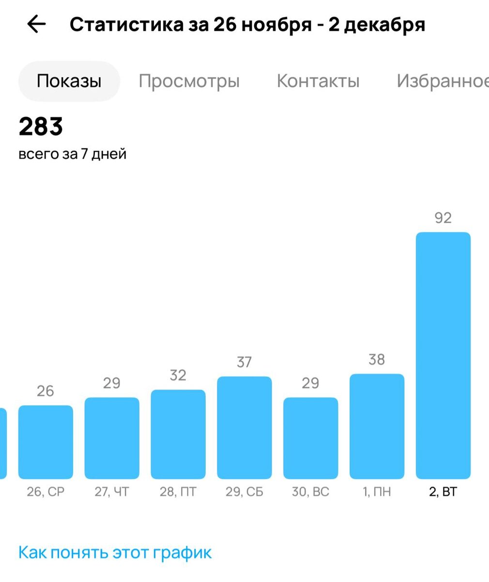 Сегодня заменила на старом объявлении 1 фото (сгенерировала через нейросети) В итоге показов и просмотров стало в разы больше чем было ранее и даже чем в первые дни Совет не универсален. Как и все в маркетинге и на авито Но если знаешь, что делать и когда и с какими объявлениями/товарами, то в итоге экономишь ресурсы