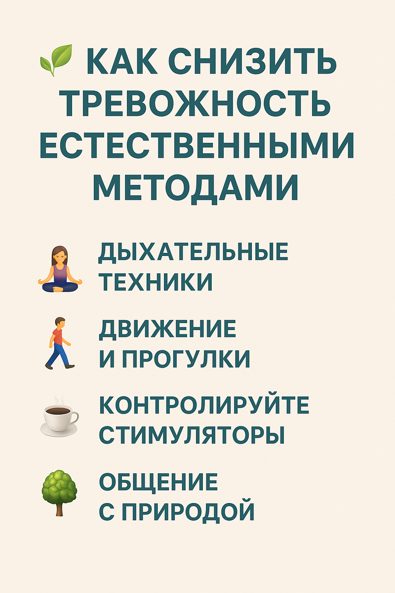 Тревога — нормальная реакция организма на неопределённость или угрозу. Но когда она начинает мешать жить, важно научиться мягко регулировать свое состояние. Хорошая новость — существуют естественные методы, которые помогают снизить уровень тревожности без лекарств 💚 🧘♀️ 1. Дыхательные техники Когда мы волнуемся, дыхание становится поверхностным. Это усиливает стрессовый ответ организма. Попробуйте дыхание 4–7–8: 🟢 Вдыхайте носом на 4 сек 🟢 Задержите дыхание на 7 сек 🟢 Медленно выдыхайте на 8 сек Повторите 4–6 раз. Уже через пару минут тело переходит в более спокойный режим 😌 🚶♂️ 2. Движение и прогулки Физическая активность снижает уровень гормона стресса — кортизола. 🚶 10–20 минут быстрой ходьбы 🧗 Легкая зарядка 🕺 Танцы под любимую музыку Даже короткая активность улучшает настроение благодаря выбросу эндорфинов 💥 ☕️ 3. Контролируйте стимуляторы Кофеин и никотин усиливают тревогу. 🛑 Сократите кофе до 1–2 чашек в день 🌿 Замените кофе на травяной чай или цикорий 🌙 Не пей