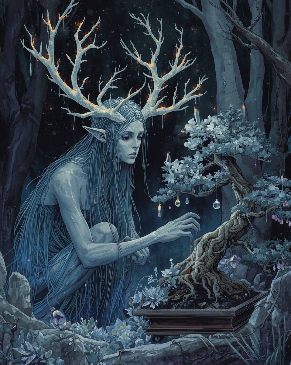 Новогоднее поздравительное письмо в стиле Джеймса Джина. Сюрреалистичная и эфемерная сцена, в которой меланхоличный лесной дух с рогами, сплетёнными из инея и нежных огоньков, ухаживает за деревом бонсай, на котором растут хрустальные украшения. Тщательная, плавная проработка линий, палитра переливающихся голубых, серебристых и глубоких фиолетовых оттенков, сочетающая классическую технику рисунка с современной фантастикой. Глубоко поэтичное и волшебное изображение. #ДжеймсДжин #НовогоднееИскусство #Сюрреализм #ФэнтезиАрт #ЭфемерноеИскусство #ЛеснойДух #Бонсай #ХрустальныеУкрашения #ИзобразительноеИскусство Промт - A New Year's postcard in the style of James Jean. A surreal and ethereal scene where a melancholic, forest spirit with antlers woven from frost and delicate fairy lights tends to a bonsai tree growing crystal ornaments. Meticulous, flowing linework, a palette of iridescent blues, silvers, and deep purples, blending classical draftsmanship with contemporary fantasy. Deeply p