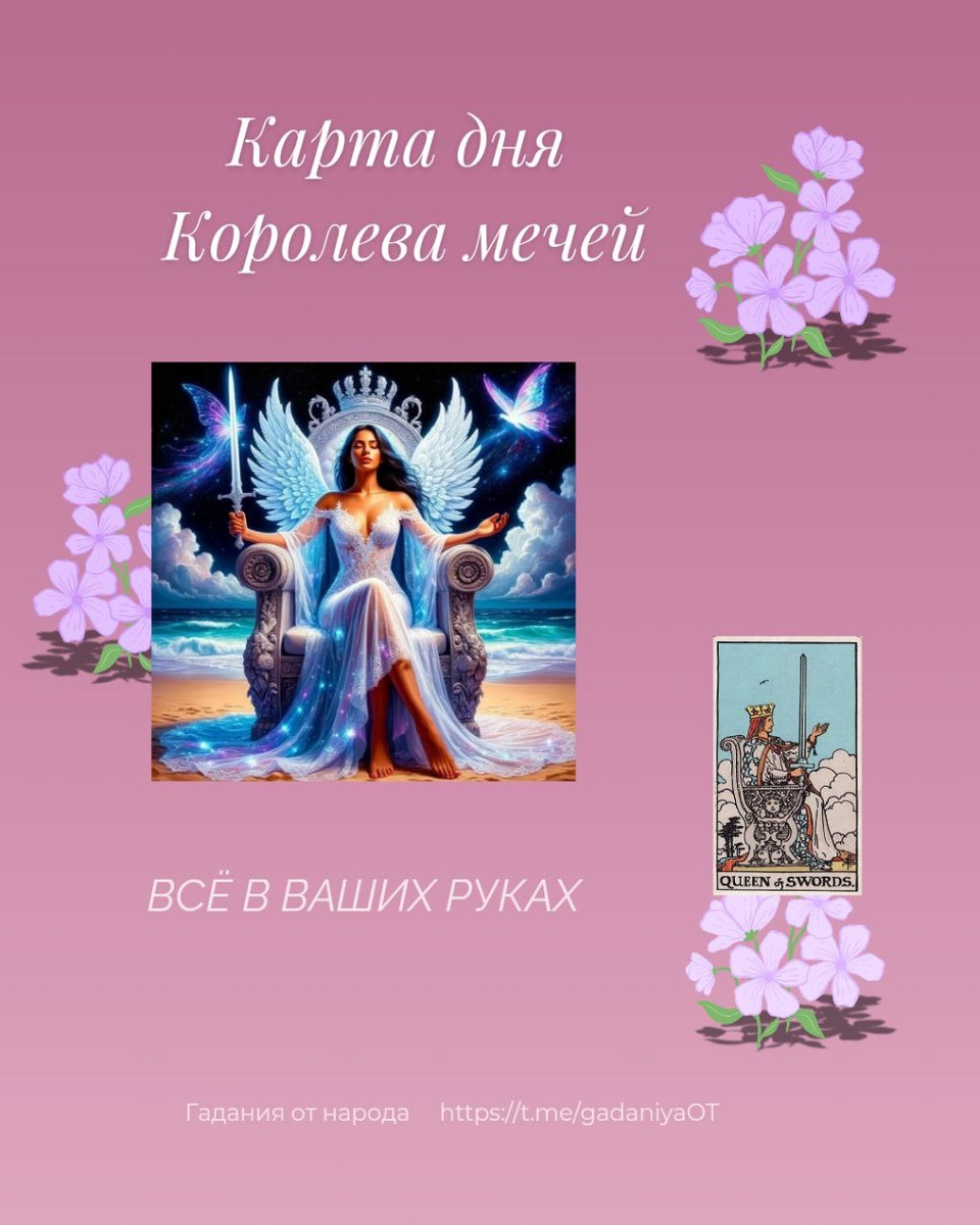 Карта дня — Королева Мечей Сегодня Королева Мечей помогает увидеть ситуацию яснее. Она не про холодность — она про внутреннюю честность и спокойную трезвость, когда можно назвать вещи своими именами и опереться на собственный разум. Это день, когда мысли собираются в единую линию, а лишний шум уходит на второй план. Поэтому, сегодня всё в ваших руках.