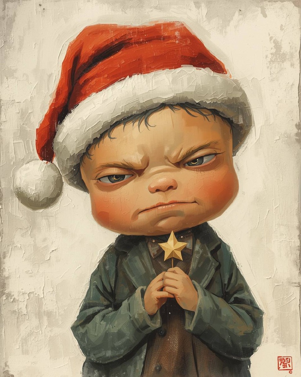 Праздничная открытка работы Ёситомо Нара. Угрюмый большеголовый ребёнок в шапке Санты, смотрящий в сторону с вызывающим выражением лица, держит в руках крошечную кривую звезду. Фон представляет собой простую текстурированную заливку снежно‑белого цвета. Работа выполнена в характерной для художника наивной, но изысканной манере акриловой живописи, передающей настроение вынужденного сладкого праздничного одиночества и тихого предвкушения. #YoshitomoNara #NaraArt #ContemporaryArt #JapaneseArt #AcrylicPainting #ArtPostcard #HolidayArt #ChristmasArt #FestiveArt #NaiveArt #ModernArt #CharacterArt #ChildInArt #SantaTheme #WinterArt #SnowyBackground #ArtStyle Промт - A festive postcard by Yoshitomo Nara. A grumpy, large-headed child in a Santa hat, glaring sideways with a defiant look, holding a tiny, lopsided star. The background is a simple, textured wash of snowy white. Executed in his signature naive yet sophisticated acrylic style, capturing a mood of reluctant, sweet holiday loneliness