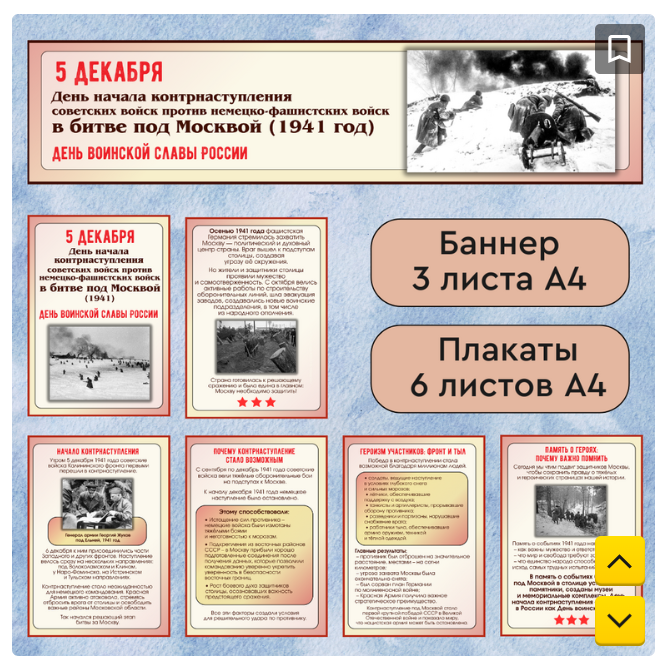 Информационные плакаты (6 листов А4). Каждый лист раскрывает подробности контрнаступления под Москвой: причины, значение, ход событий, героизм защитников столицы, роль фронта и тыла, вклад народа в разгром врага.