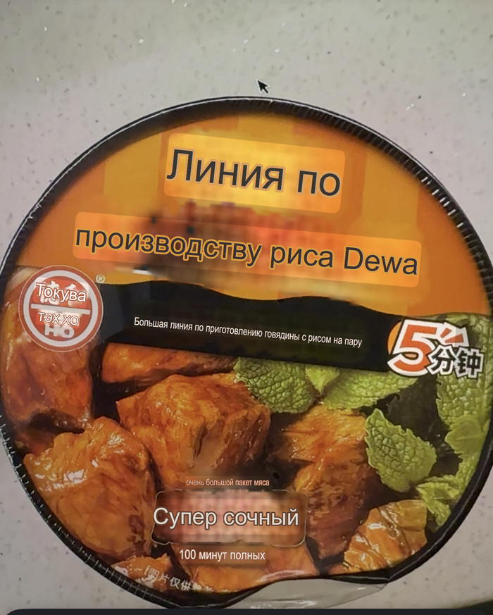 Здравствуйте, дорогие коллеги! Снова любезный друг привез гостинец из Гуанчжоу. Сегодня это рисовая лапша с мясным соусом. Причем, производитель обещает "суперсочный очень мясной соус" и целую "линию по производству риса". Любопытно. В оригинале стакан выглядит так. Откройте, милиция! Внутри аж два пакета с подливой, сушеные травы необычного вида, пакет со специями, лапша и складная вилка. Подливы целых 64 грамма. Высыпал травы. Запах интригующий, не типичный. От специй веет плотным глутаматом. Выливаем соус в стакан. Запах мощный, вкусный. Конечно, попробовал - по вкусу как бабулин гуляш, только пожирнее и специй поболе. Кипяточка до отметки и ждем. Иногда достаем, помешиваем. Видос едва передает консистенцию. А пахнет як!.. Два пакета соуса, разбавленные кипятком, стали шикарнейшим плотным говяжим бульоном. Лапша упругая, ароматная, не разварилась. На выходе имеем нажористый говяжий супец с лапшой и.. мятой! Весь пакет с зеленью - это мята, какая растет в средней полосе при каждой ре