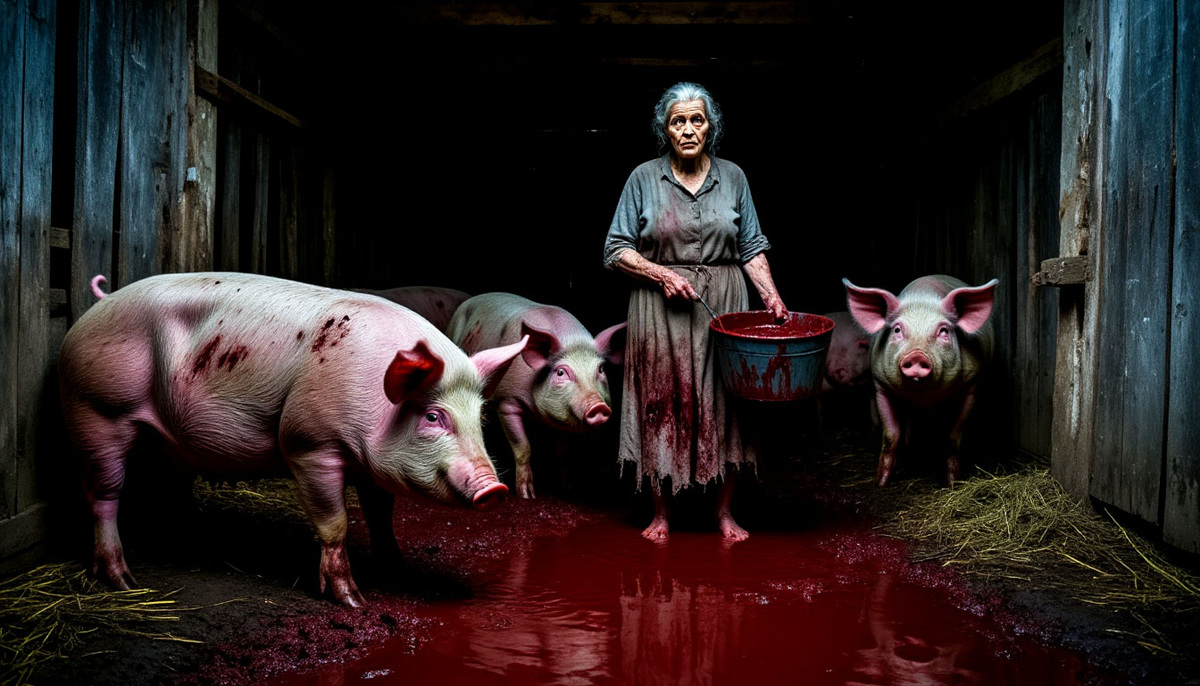 Свинарник был огромным, сложенным из массивных бревен. Это был не хлев, а бункер. Нюра стояла у открытых ворот, освещенная тусклой лампочкой. Она выливала в длинное корыто содержимое огромных баков. Что-то густое, красное, с крупными кусками.