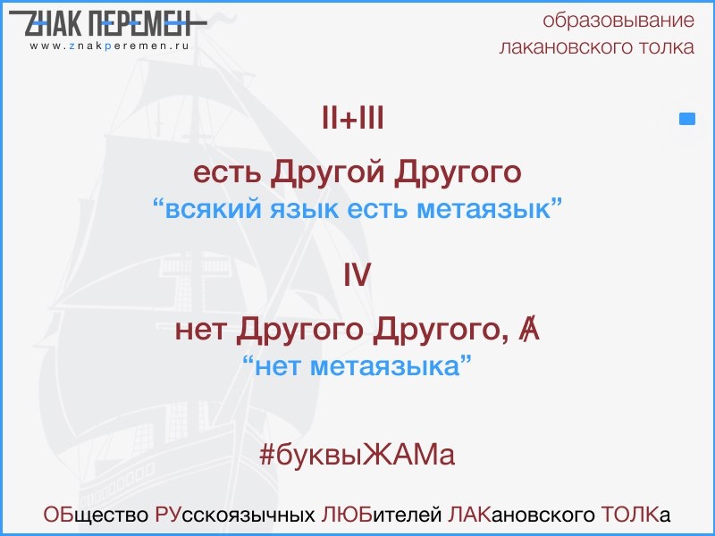 ❞ Будем исходить из концепции Другого как места означающего. Всякое авторитетное высказывание не имеет в нем никакой авторитетной гарантии, кроме самого акта высказывания; искать таковую в другом означающем бесполезно, ибо нигде, кроме этого самого места, она заведомо появиться не может. Именно это мы и имеем в виду, утверждая, что нет метаязыка, на котором можно было бы говорить, или, в более афористичной форме: у Другого нет Другого. Это слова Лакана из статьи «Ниспровержение субъекта» (1960), хотя постулат «у Другого нет Другого» появился уже в Семинаре VI. То есть после возведения Другого Другого, как означающего-гаранта, Лакан быстро перечеркнул трансцендентное измерение его существования. В курсе 1982-1983 «Du symptôme au fantasme et retour» Жак-Ален Миллер скандирует уже эти два момента: первый момент (~1955-58) – (II+III) «всякий язык есть метаязык» → есть Другой Другого (III) есть класс как единое (III) + есть класс как множество (II) второй момент (с ~ 1960) – (IV) «нет