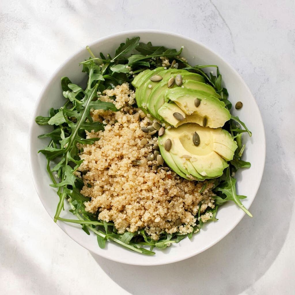 Смешайте киноа, рукколу, авокадо и семечки. Заправьте оливковым маслом, лимонным соком, солью и перцем.