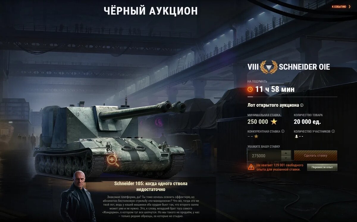 Четвёртый лот аукциона: Schneider 105 DCA Oie. Чёрный рынок 2025 в Мире танков