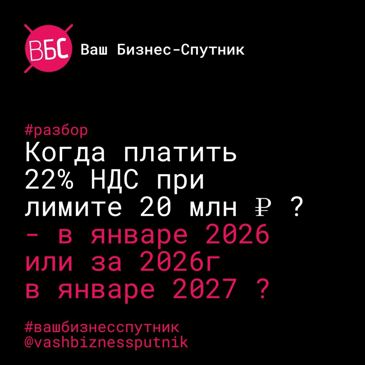 Что делать… появилась путаница про НДС 22% и порог 20 млн - платить уже в 2026 или за 2026 год?! Если НДС 22% применят “задним числом” за 2025 год, то он может ударить по прибыли за 2025 год! Ситуация с новым лимитом в 20 млн рублей вызывает серьезные опасения. Главный вопрос: когда именно начнут применять новый порог — к доходам за 2025 год или за 2026 год? Есть разночтения в формулировках, и пока непонятно, что верно. Одни источники пишут: - «новый порог в 20 млн — 2026 г.» - другие: «в 2026 году платить НДС от 20 млн». Из-за этого путаницы становится только больше. Представьте: микробизнес продал в 2025 году на 34 млн или 59 млн, подошел к порогу в 60 млн с 20% — они это учли в стратегии на 2025 год. А им говорят: «теперь в январе 2026 заплатите 22% за разницу в 14 или 39 млн». К этому бизнес не готов. Это может для них стать катастрофой, т.е. налог в 22% от дохода убьет прибыль. По логике, уплата 22% с лимитом 20 млн должна происходить в январе 2027 года, а лимит дохода д