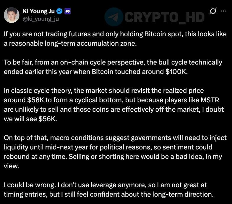🤔 CEO CryptoQuant: ➠ Согласно классической теории циклов, Биткоин должен откатиться к $56,000, но подобный сценарий маловероятен из-за крупных холдеров, не склонных продавать. ➠ С точки зрения ончейн-циклов, бычий рынок формально завершился, когда BTC достиг отметки $100,000. ➠ Текущая зона выглядит разумной для долгосрочного накопления Биткоина при спот-стратегии. ➠ Макроусловия и необходимость вливания ликвидности до середины следующего года могут поддержать рынок и улучшить настроения в любой момент (twitter) Crypto Headlines