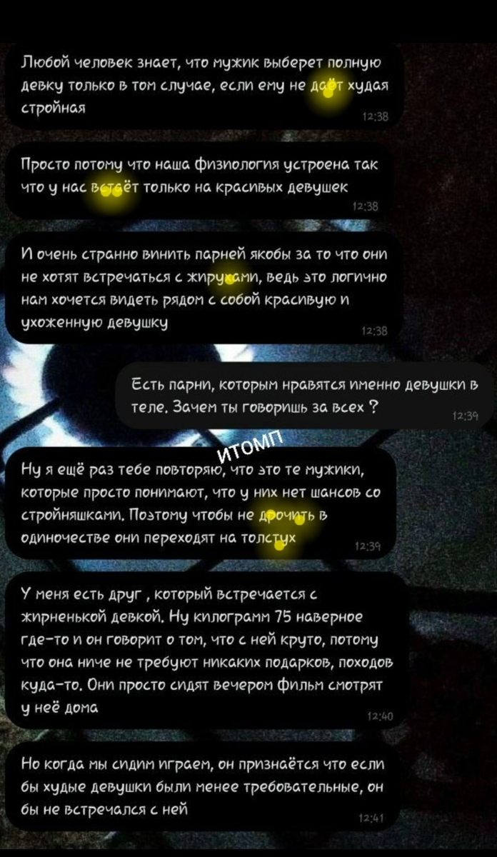 Всем привет! Друзья, мы с вами как-то уже обсуждали полных женщин и отношение к ним мужчин. Хочется продолжить. Поэтому я принесла вам нечто мерзкое. Очень мерзкое. Особо неприглядное - замазано. Пост - поболтать. Просто интересно: чье мнение вы разделяете? Я понимаю, что мерзкая здесь в основном сама манера, сам способ донесения основной мысли до собеседника. Я понимаю, что в общем и целом физиологию никто не отменял. Именно поэтому я хотела бы разобраться в теме. Много ли общего слова молодого человека имеют с объективной действительностью. Фото для привлечения внимания;)
