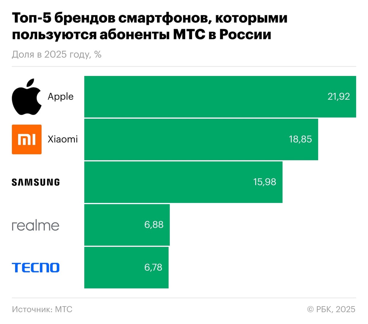 iPhone занял первое место среди брендов смартфонов у россиян, пишет «РБК» со ссылкой на статистику от оператора мобильной связи МТС