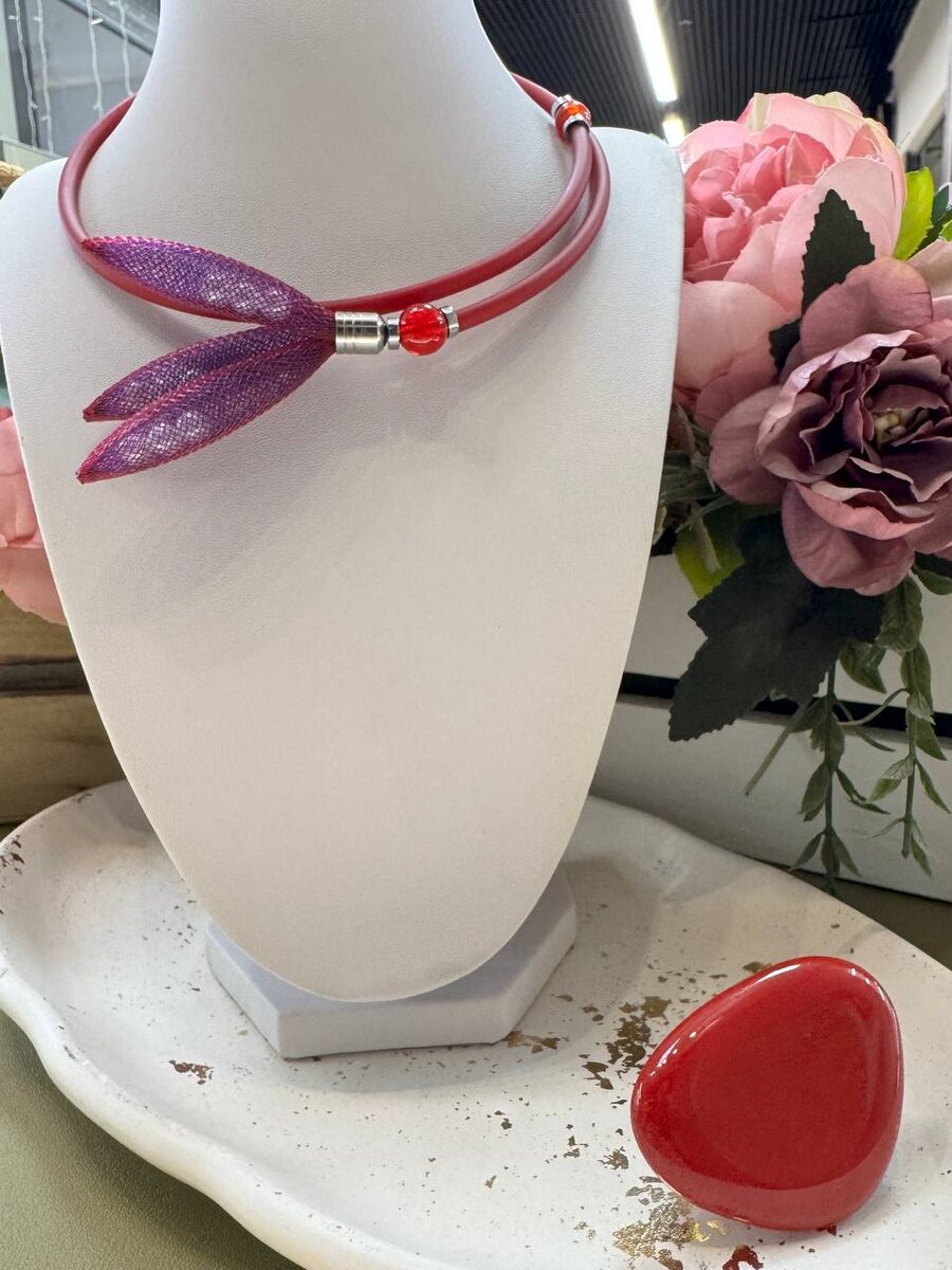 Колье-стрекоза — акцент, который невозможно не заметить. Лёгкие фиолетовые «крылья» и тёплый красный шнур создают яркий, живой контраст, будто маленькое чудо село прямо на вашу шею. Украшение смотрится игриво, свежо и сразу делает образ более смелым и творческим. Характер, цвет и лёгкость — всё в одном аксессуаре. Колье 4350-15%=3.697,5 Кольцо 2850 ✨Нажмите для заказа ✉️ Нажмите чтобы задать вопрос