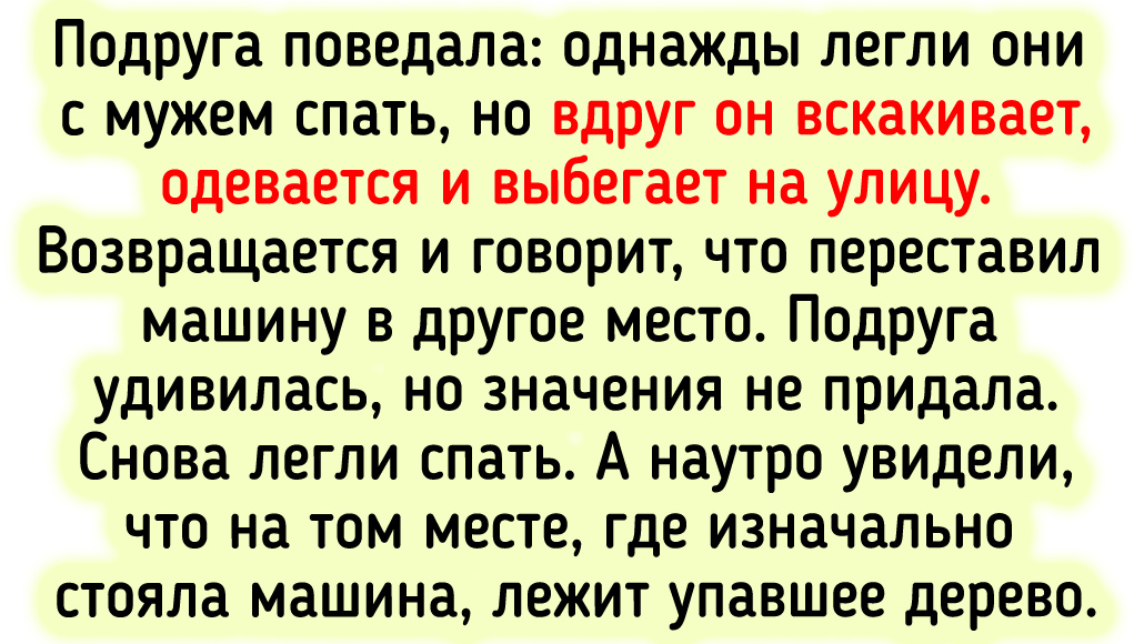 Подруга поведала: однажды легли они с мужем спать, но вдруг он неожиданно вскакивает, одевается и выбегает на улицу. Возвращается и говорит, что переставил машину в другое место. Подруга удивилась, но особо значения не придала. Снова легли спать, а наутро увидели, что на том месте, где машина изначально стояла, лежит упавшее дерево.