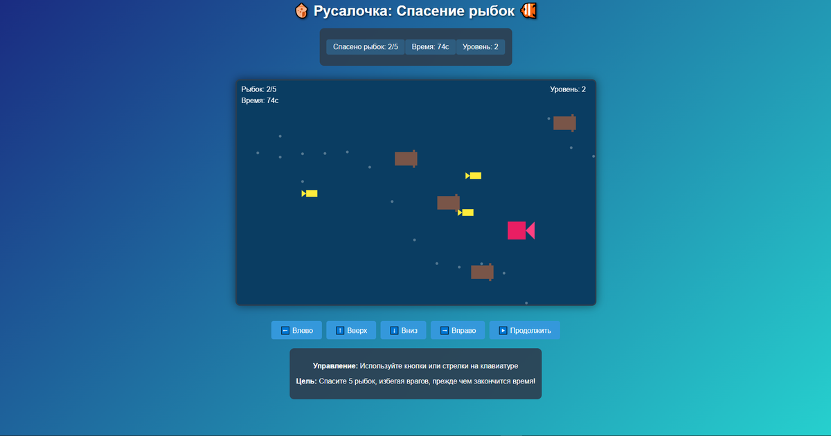 Представьте себе таинственные глубины океана, где среди коралловых рифов и затонувших сокровищ живёт прекрасная русалочка. Но её мир в опасности! Злые акулы охотятся на беззащитных рыбок, и только вы можете помочь ей спасти маленьких обитателей моря. «Русалочка: Спасение рыбок» — это увлекательный платформер, который сочетает в себе: Ваша задача — помочь русалочке собрать всех рыбок и избежать встречи с опасными акулами. Но будьте осторожны — время ограничено! Особенности игры: Ссылки на игры моих товарищей: