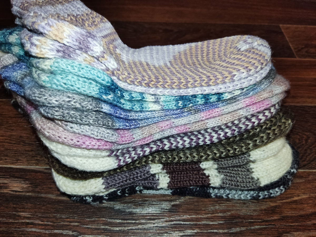 Совершенно неожиданно поняла, что между делом связала 8 пар носочков. То пряжу проверяла, то остатки пристраивала, то идею новую обдумывала. В этой стопочке есть особо любимые носочки. Пряжа Fabel long print от DROPS 75 % перуанская шерсть 25% полиамид. Идеальный состав. Тактильно очень приятна. Носочки тоненькие. Обожаю короткие, поэтому сине-серо-голубые оставлю себе. Возможно вам пригодится узнать как ложатся полосочки. Эту пряжу купила для эксперимента. Носки получились прикольные, специально не добивалась симметрии. Из NACO boho вяжу не в первый раз, в процессе использования носочки могут закататься слегка. Но не критично. Впервые купила эту пряжу. Астра Карелия. Цвет секций распределился очень фантазийно. Носочки мягкие, связаны резинкой 2х2. Пятка Стронг. Для тех кто любит невесомые изделия. Они какие-то такие и получились. Как будут носиться проверим. В следующих трёх парах просто пристраивала остатки пряжи. Метод Хеликс очень люблю. Приятная полосатость выходит. К по