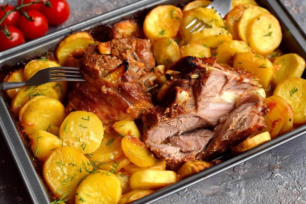 Проверьте мясо — оно должно легко протыкаться ножом, а картофель быть мягким. Если вы готовите целую голень или крыло, увеличьте время запекания до 1,5 часов.