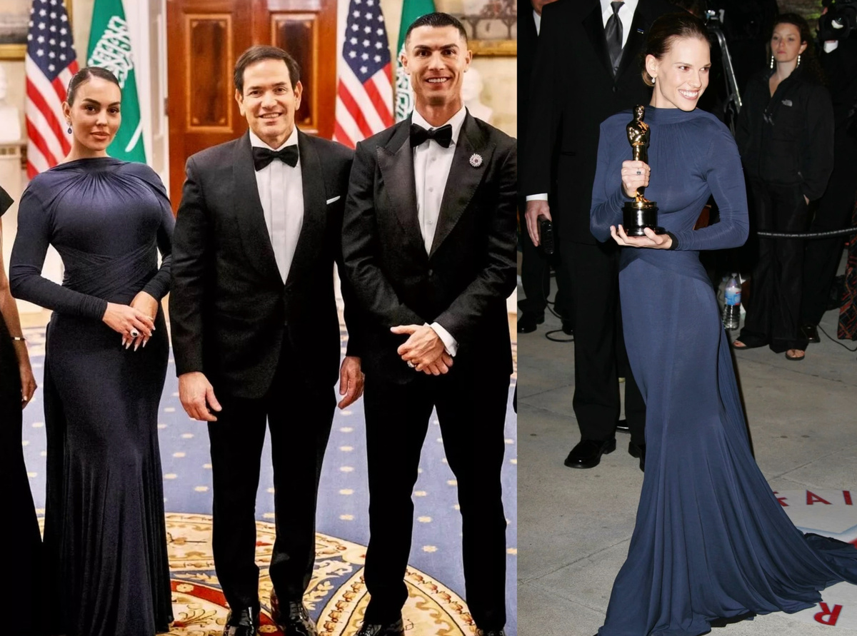 Иногда мода обгоняет дипломатию — и именно это произошло на недавнем ужине в Белом доме, куда Криштиану Роналду пришёл со своей невестой Джорджиной Родригес. Пока политики обменивались приветствиями, весь свет обсуждал не переговоры, а её платье — насыщенно-синее, идеально скульптурное, с линиями, которые будто вылеплены на теле. И если вам показалось, что вы уже где-то это видели, значит, ваша модная память работает безупречно. Этот образ действительно вызывает один из самых ярких флэшбэков в истории красных дорожек: именно в таком платье легендарная актриса Хилари Суэнк получила свой «Оскар» за роль в фильме «Малышка на миллион». Платье от бренда Guy Laroche, весна-лето 2005 — насыщенный тёмно-синий тон, плотная ткань, чёткая выстроенная линия плеч, идеальный силуэт, эффект «второй кожи». Именно этот силуэт стал символом победы, уверенности и репутации. И вот сегодня — в контексте не менее значимом: вечерний протокол Белого дома, холодный ноябрь, строгая архитектура пространства, и