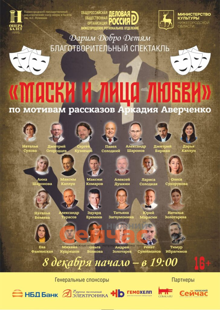 20 известных предпринимателей Нижнего Новгорода выйдут на сцену в роли актеров благотворительного спектакля (16+), сообщает пресс-служба НРО «Деловая Россия». Нижегородское реготделение «Деловой России» реализует проект «Дарим Добро Детям» с целью поддержки одаренных детей региона седьмой год подряд. В сообщении говорится, что стартовала продажа билетов на благотворительный спектакль в рамках проекта «Дарим Добро Детям», который ежегодно реализует Нижегородское региональное отделение общероссийской общественной организации «Деловая Россия». В этом году известным предпринимателям и политикам Нижегородской области предстоит перевоплотиться в героев рассказов Аркадия Аверченко. Постановка «Маски и лица любви» (16+) включает в себя несколько юмористических рассказов знаменитого издателя журнала «Сатирикон». Зритель погрузится в атмосферу начала 20-го века и сможет оценить колкий юмор писателя на извечную тему взаимоотношений мужчин и женщин. Премьера спектакля состоится 8 декабря в 19.00 н