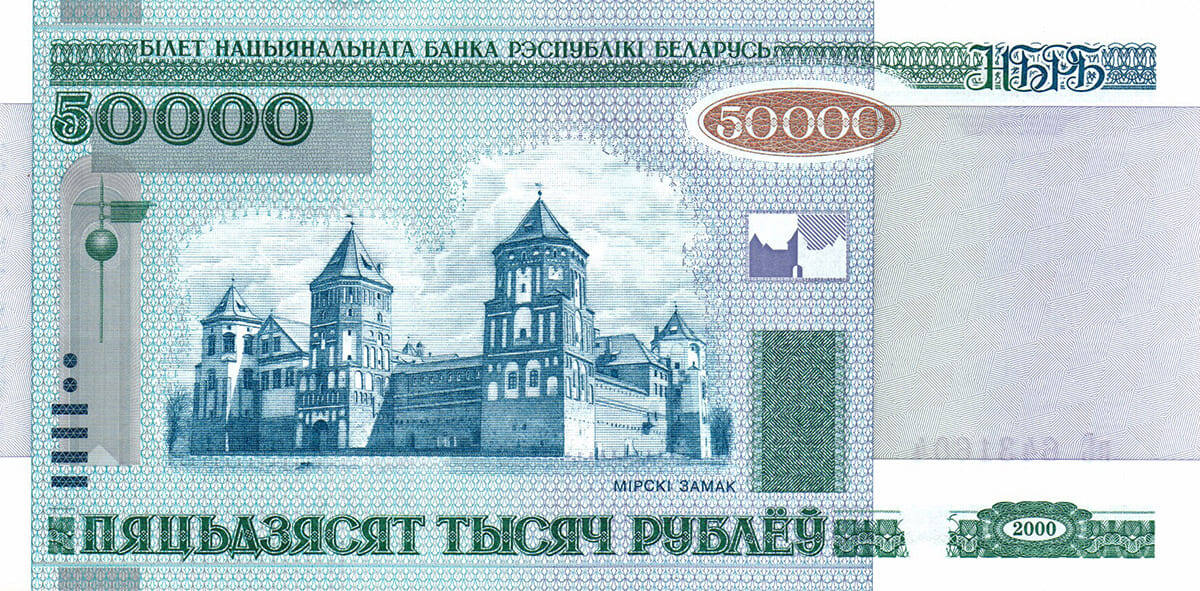 Размер: 150×75. Основной цвет голубой и серый. Защитные элементы: водяной знак с изображением башни Мирского замка и ныряющая нить, которая в новой модификации заменила защитную полимерную нить. Вдоль верхнего края проходит полоса, украшенная орнаментами из гильошей; по ней, по центру, идет надпись с названием банка-эмитента (БIЛЕТ НАЦЫЯНАЛЬНАГА БАНКА РЭСПУБЛIKI БЕЛАРУСЬ) и его аббревиатурой (НБРБ), с правой стороны, на белорусском языке. Под полосой цифрами указан номинал банкноты (50000) на прямоугольнике с микротекстом из повторяющейся аббревиатуры «НБРБ». Ниже находится изображение стилизованной колонны и метка для людей с ослабленным зрением исполненные рельефной печатью. Центральную часть банкноты занимает изображение замково-парковый комплекса «Мир» с подписью «МІРСКІ ЗАМАК» - это оборонительное укрепление и резиденция в Гродненской области Беларуси. Памятник архитектуры, внесён в список Всемирного наследия ЮНЕСКО (с 2000 года). Справа вверху овальная розетка с числом номиналом банкноты "50000", которая при наклоне банкноты меняет цвет с золотистого на зеленый. Ниже совмещающееся изображение, где неокрашенный элемент заполняется цветом фрагментов оборотной стороны, образуя законченный (единый) рисунок. Под ним прямоугольник со скрытым изображением - буквы "РБ" становятся видимыми при рассматривании банкноты по острым углом зрения к источнику света. Справа место для водяного знака с антикопировальной сеткой образованной непрерывно повторяющимися штриховыми элементами. Снизу проходит полоса, украшенная орнаментами с указанием прописью номинала банкноты "ПЯЦЬДЗЯСЯТ ТЫСЯЧ РУБЛЁУ", в правом углу внутри виньетки указан год выпуска первой банкноты (2000).