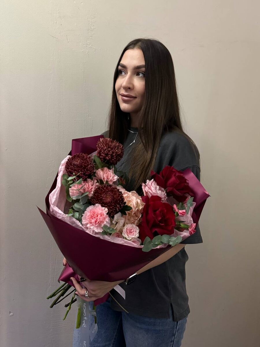Дорогие друзья, мы представляем вашему вниманию букет, созданный для истинных ценителей красоты. 😍 В его основе — шоколадные хризантемы, которые дарят ощущение тепла и уюта. Центральным аккордом выступает величественная красная французская роза — символ совершенной любви. Ансамбль дополняют нежные диантусы и пышные соцветия гортензии, придающие букету объем и воздушность. Элегантная бордовая упаковка завершает образ, делая его идеальным подарком для самых важных моментов. Стоимость букета - 7690₽, вместо 8900₽ Подарите эмоции, которые останутся в памяти: @courrierofhappiness_bot