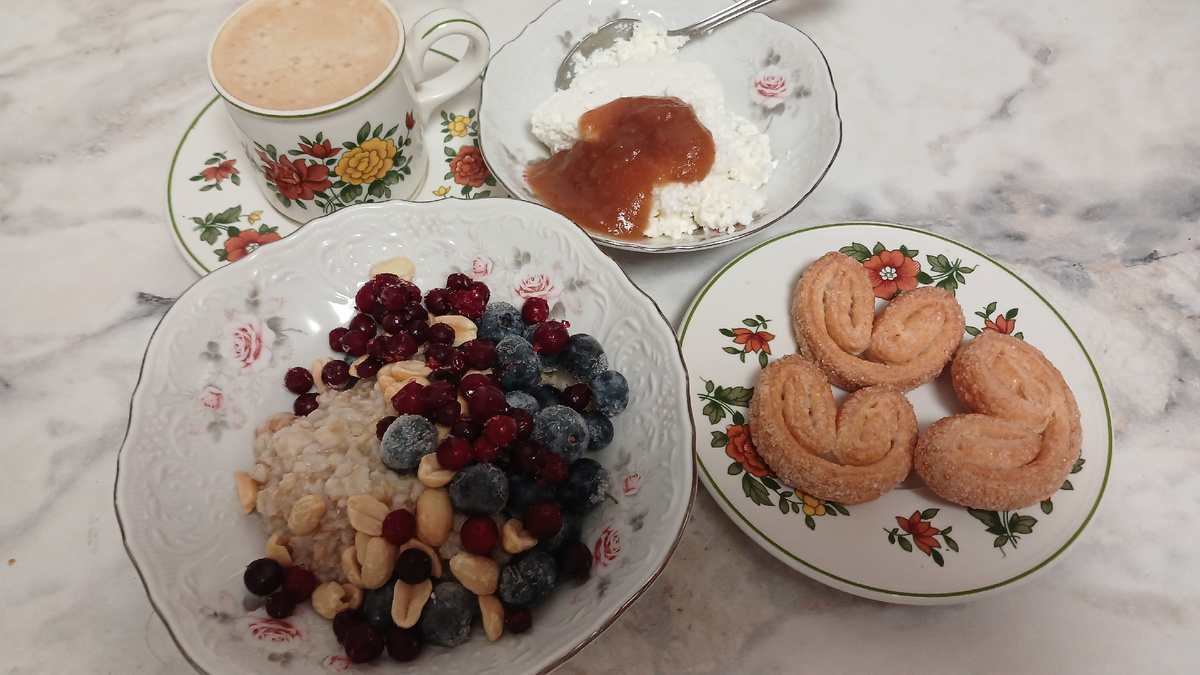 В ноябре мы питаемся на сумму прожиточного минимума, это 351 руб в день на человека. На начало месяца у нас были почти полностью пустые шкафчики и морозилка. На завтрак сегодня овсяная каша и творог. Творог с яблочным джемом, к кофе - слоеные завитушки в кашу положила голубику, бруснику и арахис На обед был гречневый суп с фрикадельками и пожарила стейки тунца. К тунцу - маринованная капуста. Тунец в Смарте отличный, и дешевле я нигде не видела. У кого есть Смарт - обратите внимание. Потом еще кофе попила, сделала себе к кофе бутерброд с сыром. Булочка ржаная домашняя На ужин потушила куриную печенку в сливках. Гарнир - киноа. Вчера сварила с запасом. И айсберг с помидорами. На десерт - мандарин. Меню год назад