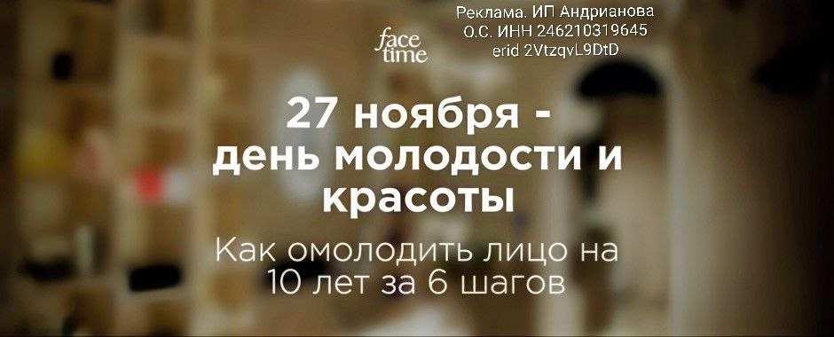 ✨ Бутику молодости и красоты «face time» 2 года и в честь дня рождения дарят пользу, подарки и скидки! ✨ 📎 27 ноября в бутике пройдет день молодости и здоровья! 6 локаций / 6 специалистов! (о каждой локации подробно рассказали в картинках поста) 📎 Вы получите пошаговую индивидуальную инструкцию: Как омолодить лицо на 10 лет за 6 шагов 🎊А также приятные бонусы: • Авторский экспресс-массаж лица каждой в ПОДАРОК • -10% на процедуры в этот день • План омоложения лично для вас Начало: с 15:00 до 21:00 Время прохождения: 30-40 минут Запись по телефону: 📞 +79131977578 Октябрьская, 16 | ЖК «Метрополис» @expert_face_fitness 👈 подписывайся