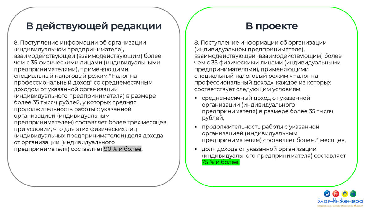 Самозанятые – новый критерий для индикатора риска ℹ️ Изменят критерии срабатывания индикатора № 8 в Перечне, утверждённом приказом Минтруда от 30.11.2021 № 838н. Соответствующий проект размещён на портале проектов НПА. В пояснительной записке к проекту Минтруд отметил, что при анализе информации, за IV квартал 2024 года, выявлено порядка 200 организаций, которые взаимодействует со 100 самозанятыми, средний доход которых 30 тысяч рублей, доля дохода от организации (ИП) составляет 80%. Индикатор риска в отношении них не срабатывает, но при этом у указанной организации может быть, например, 40 самозанятых, у которых среднемесячный доход более 35 тысяч рублей и доля дохода от организации (индивидуального предпринимателя) более 90%. Таких организаций Минтруд насчитал более двухсот! Индикатор риска в текущей редакции сработал порядка 600 раз в год, в проектируемой редакции индикатор будет срабатывать более 800 раз в год, что повысит эффективность его работы. Скачать приказ Минтруда Росс