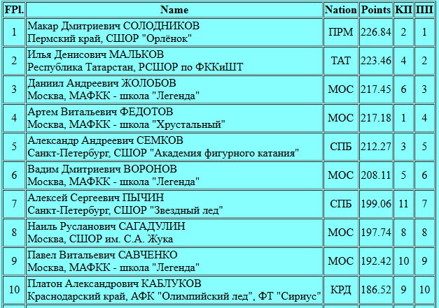 Заслуженная победа у Макара Солодникова (226.84 - 1 место🥇) из Перми, который после своего неожиданного бронзового успеха на последнем Первенстве России продолжает прогрессировать. С четверным тулупом, видимо, сейчас проблемы, но зато появился высоченный четверной сальхов с красивым риппоном. Во второй половине программы Макар начал уставать, сделал бабочку на лутце, но дотерпел, других ошибок себе не позволил и может принимать поздравления со вторым по значимости достижением в своей карьере, которым можно назвать золото этапа Гран-при.