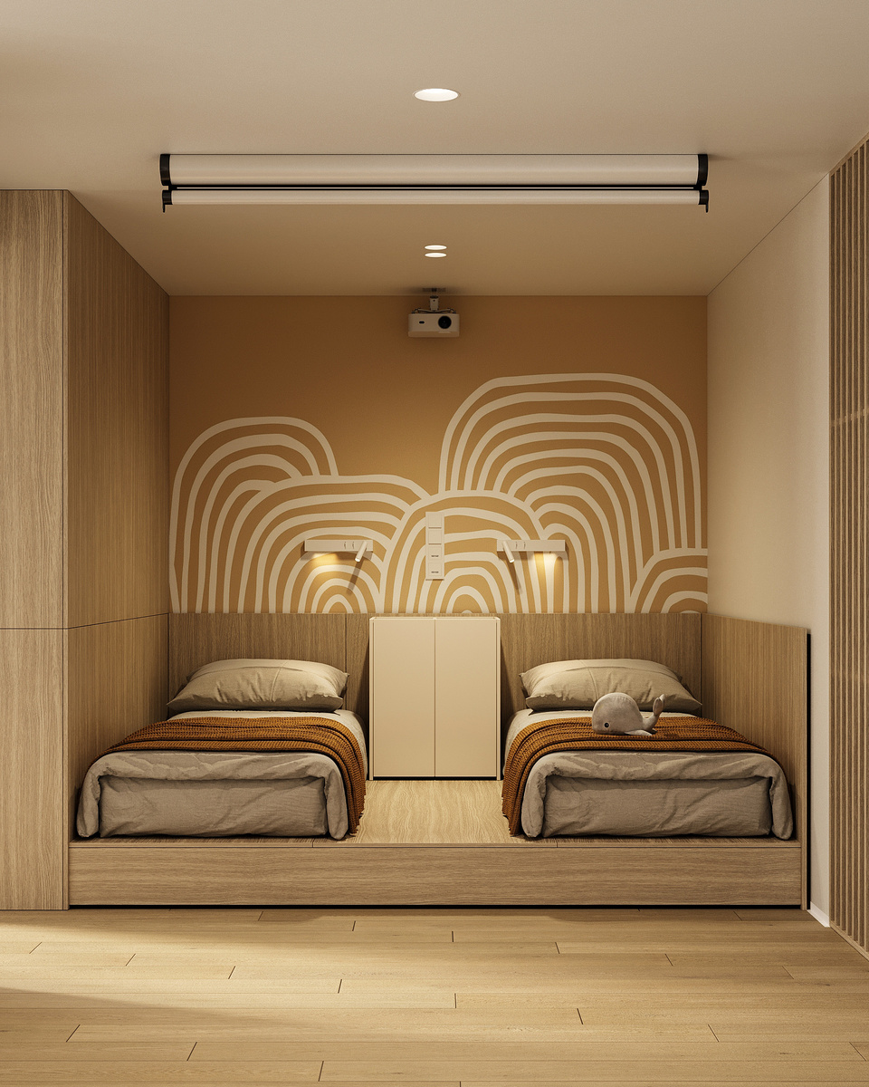 - полный ремонт комнаты - большая комната (квартира) 35 квм с лоджии - ломанной формы - отдельная гардеробная Комната необходимо спроектировать на 2 девочек 3 и 1 года - 2 кровати - 2 рабочие зоны - шкафы для одежды не нужны так как есть гардеробная - и разместить проектор Получилось - Спальную зону размещаем в нише, подальше от окна. Отступаем расстояние от радиатора, и делаем большой подиум для матрасов стандартных размеров 900х2000. Так мы избегаем узкого проема между кроватями и упрощаем визуал. По центу ставим тумбу с внутренним хранением, чтобы поставить стакан воды или спрятать книги. Сбоку не оставляем просто трубы, мы их скрываем за большим шкафом, доступ к трубам через распашные фасады, остальное под хранение. В этой ж зоне устанавливаем проектор, крепим к потолку. И напротив подвешиваем экран. Перед сном или просто отдыхая на кроватях можно будет раскрутить экран, и посмотреть кино. Дополнительно установили легкую перегородку, чтоб сразу в глаза не бросалась спальня