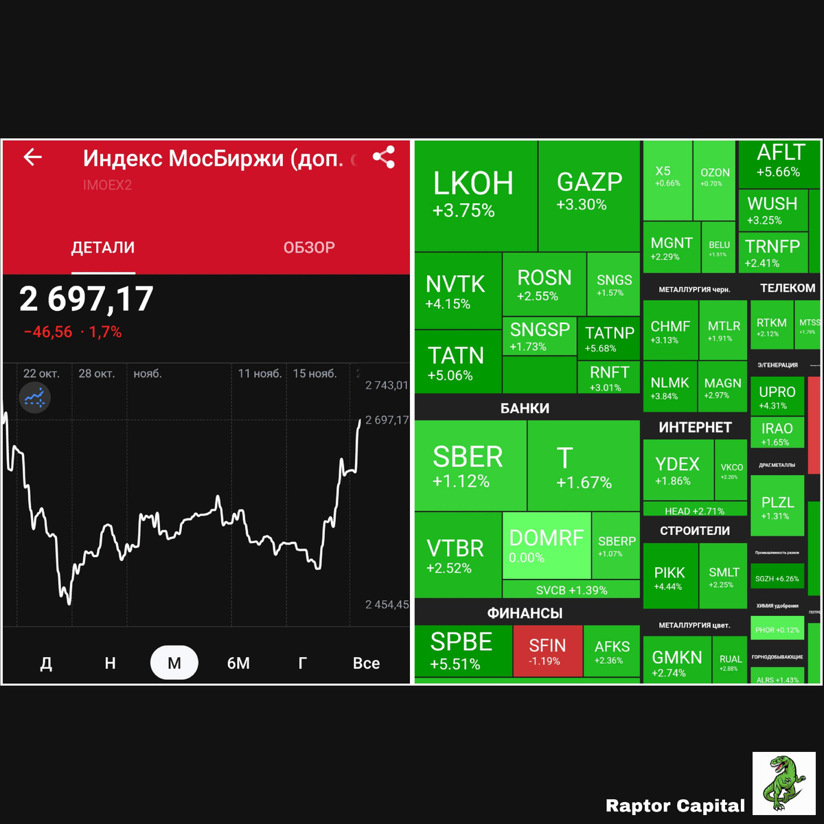 📌 Индекс Мосбиржи вчера на вечерней сессии вырос на 2,7% до 2697 пунктов. Ждать ли продолжения роста рынка? Делюсь своими мыслями о рынке, инфляции и ключевой ставке. • Индекс Мосбиржи вчера закрылся на 2697 пунктах, но в моменте достигал даже 2710 пунктов. С учётом того, что начинали неделю на 2500 пунктах – рост действительно впечатляющий. • Главная и почти единственная причина роста – вновь возникшие ожидания позитива по геополитике. США представили очередной мирный план из 28 пунктов. Довольно много пунктов в пользу РФ, поэтому одобрение плана от ЕС и Украины пока кажется маловероятным. • Наибольшим ростом вчера отреагировали Сегежа (+6,3%), Татнефть-ап (+5,7%), Аэрофлот (+5,7%), СПБ Биржа (+5,5%). Примечательно, что нулевой динамикой отметились в первый день после IPO акции Дом РФ, и закономерно в минусе закрылись SFI (–1,2% на фоне продажи Европлана) и Софтлайн (–0,7% на фоне плохого отчёта). • Судя по всему, повышение НДС ещё не начало влиять на темпы инфляции, недельные данные