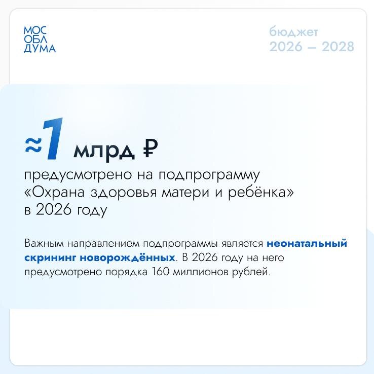 В 2026 году из бюджета Московской области на реализацию подпрограммы «Охрана здоровья матери и ребёнка» предусмотрено порядка 1 миллиарда рублей 🔹Важным направлением подпрограммы является неонатальный скрининг новорождённых. Подробнее об этом рассказал председатель Комитета Мособлдумы по социальной политике и здравоохранению Андрей Голубев. «Уже доказавший свою эффективность инструмент, программа расширенного неонатального скрининга новорождённых, стартовала по всей стране, включая, конечно, и Подмосковье, с 2023 года. Сегодня он включает исследование на 36 генетических заболеваний. Это возможность выявить на самых ранних, доклинических стадиях такие заболевания, как врождённый гипотиреоз, первичный иммунодефицит или спинальную мышечную атрофию. Здесь принципиально важен следующий шаг: если анализ показывает отклонение, с родителями связывается специалист. Таким образом, выявленный диагноз становится точкой отсчёта для своевременного, правильного лечения. Уже в этом году в Подмосков