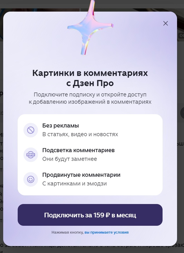 Что-то давно не заходила на каналы, на которые подписана. Раньше с удовольствием общалась, делилась чем могла, в том числе и фотографиями. А теперь оказалось, что это можно сделать только за деньги. Дзен вообще с дуба рухнул. Вот скажите, на фига мне платить по 159 рублей в месяц, чтобы оставлять на чужих каналах комментарии с картинками? Да вы спасибо должны сказать всем, кто вообще что-то комментирует, а не деньги с них драть. Вы как считаете, много найдется желающих оформлять подписку ради фоточек под комментариями?