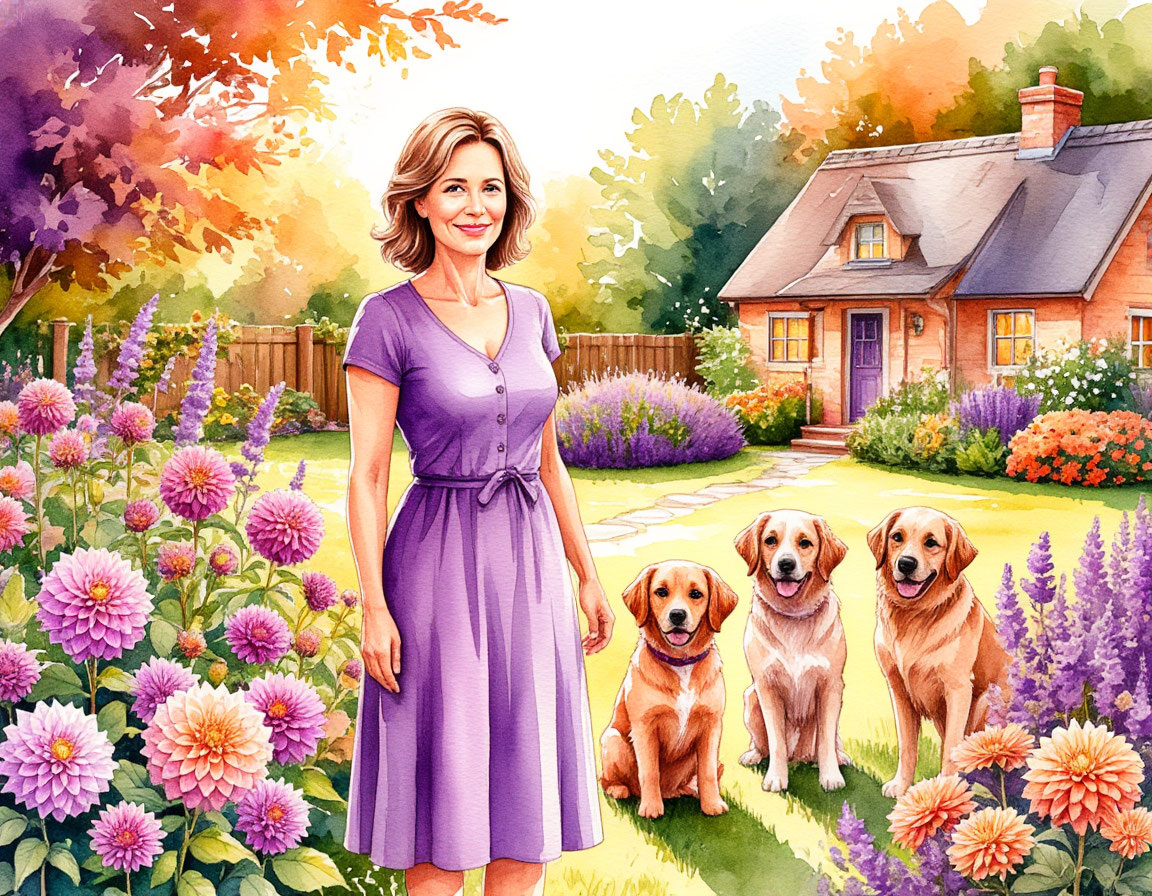 Нежная акварельная иллюстрация: на переднем плане женщина 45 лет в лавандовом платье стоит в цветущем саду среди георгинов и астр, рядом с ней три разномастные собаки, солнечный свет мягко освещает её лицо с лёгкой улыбкой и сияющими глазами. На заднем плане — уютный дачный домик и грядки с овощами. Тёплая цветовая палитра: оттенки лаванды, персика, золота и зелени. Мягкие размытые края, воздушная лёгкая манера письма, передающая атмосферу покоя, тепла и внутреннего света. Стиль: современная ботаническая акварель с элементами импрессионизма.