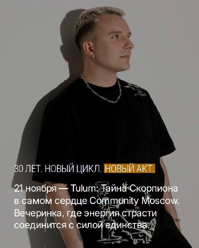 TULUM ACT II: ТАЙНА СКОРПИОНА в Community 21 ноября В пятницу Community станет центром притяжения для тех, кто живёт музыкой, движением и внутренним огнём. В эту ночь мы отмечаем день рождения Wein — основателя творческого объединения TULUM. По этому случаю состоится Акт II — «Тайна Скорпиона» — особый перформанс и музыкальное путешествие, созданное теми, кто формирует атмосферу TULUM и вдохновляет вокруг себя. На площадке выступят артисты школы TULUM, а кульминацией станет редкое B2B с гостем из Дубая — мощный диалог энергий, который можно прожить только здесь и только один раз. Пусть эта ночь станет вибрацией, которую мы создадим вместе. 🎫 Билеты Fc 18+ DC: Scorpio Heat 📆 21 ноября, в 20:00 📍 Community Moscow, Космодамианская наб., 2