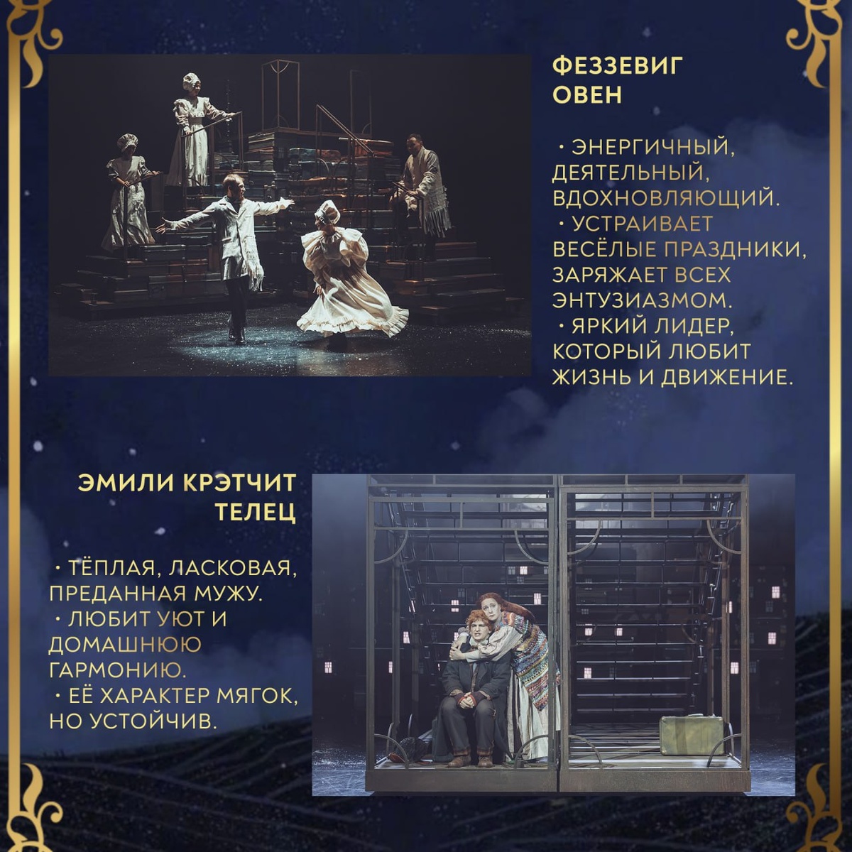 «Рождественская песнь» под звёздами✨ Каждый персонаж Диккенса обладает ярким, узнаваемым характером. Мы проанализировали их поступки, мотивацию и внутренние качества, чтобы составить астрологическую карту героев спектакля «Рождественская песнь». Почему Скрудж — типичный Козерог? Какой знак идеально подходит для оптимистичного Фреда? И кто из них самый неисправимый романтик? Ищите свой знак в карточках! Совпала ли ваша стихия с характером персонажа? Делитесь впечатлениями и приходите на спектакль! 🟥«Рождественская песнь» | 6+ 3 декабря | 18:00 4 декабря | 14:00 и 18:00 7 января | 15:00 и 18:00 8 января | 11:00 и 14:00 Купить билеты