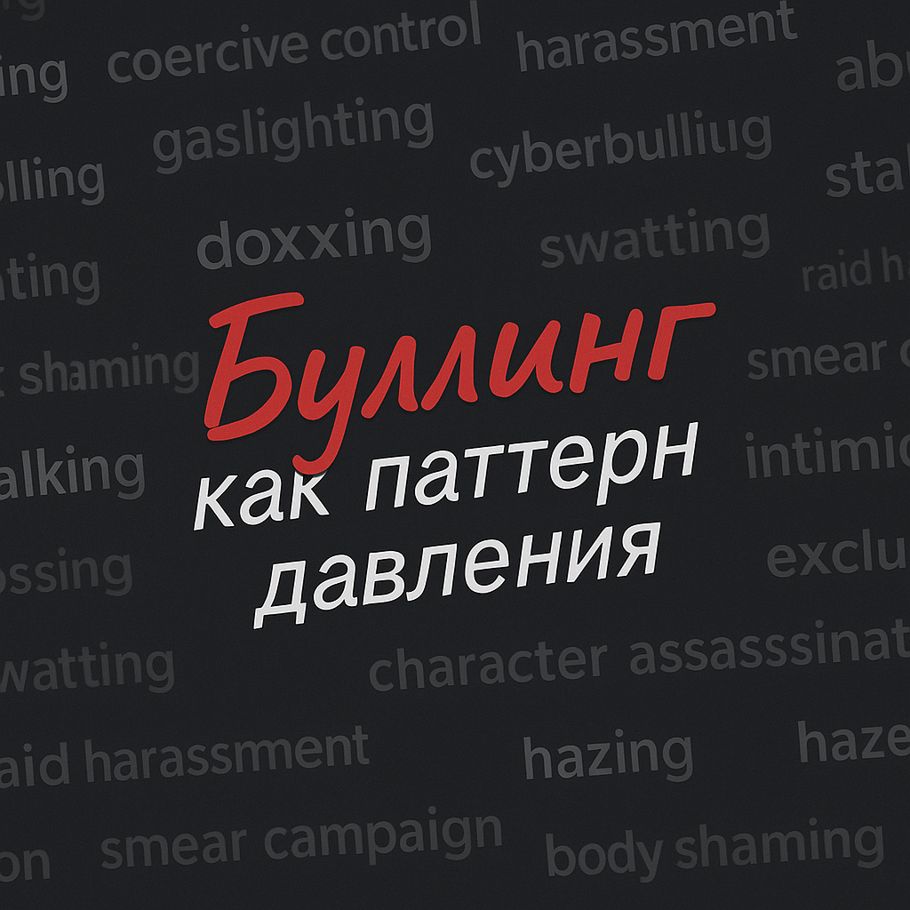 Сразу договоримся о языке. В этой серии я называю буллингом любой устойчивый паттерн давления: в паре и семье, на работе, в школе и университете, в сети. У явления десятки имен: абьюз, коэрцитивный контроль, моббинг, боссинг, харассмент, кибербуллинг и т. д. Само изобилие терминов уже маркер распространенности: когда практики повсюду, язык дробится. Чтобы видеть суть, а не тонуть в словаре, держим три признака в фокусе: систематичность, дисбаланс силы/ресурсов, ущерб и контроль.