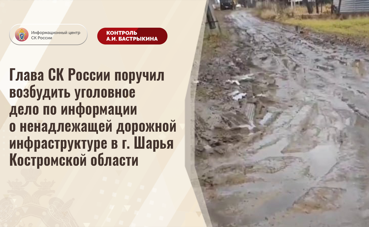 Глава СК России поручил возбудить уголовное дело по информации о ненадлежащей дорожной инфраструктуре в г. Шарья Костромской области В телеграм-канале сообщается о нарушении прав жителей города Шарья Костромской области на качественную дорожную инфраструктуру. На протяжении нескольких лет автомобильная дорога на улице Лермонтова находится в непригодном состоянии: отсутствует асфальтовое покрытие, грунтовое полотно при выпадении осадков регулярно размывается, на поверхности образовались многочисленные ямы и колеи. В связи с этим проезд транспортных средств, в том числе автомобилей экстренных служб, затруднен. Многочисленные обращения в компетентные органы результатов не принесли. В СУ СК России по Костромской области организована процессуальная проверка. Председатель Следственного комитета Российской Федерации Александр Иванович Бастрыкин поручил руководителю СУ СК России по Костромской области Денису Николаевичу Левченко возбудить уголовное дело и представить доклад о предварительных
