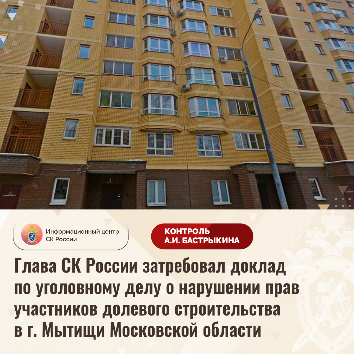 Глава СК России затребовал доклад по уголовному делу о нарушении прав участников долевого строительства в г. Мытищи Московской области