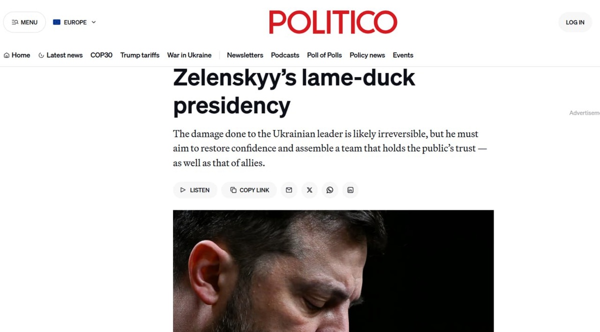 Zelensky SIGNIFICANTLY loses his support among Ukrainians, making him a 'lame-duck' — Karatnycky opinion for Politico Corruption scandal reduced his electoral support almost twice, making it 25% How much longer can he hold on to his post?